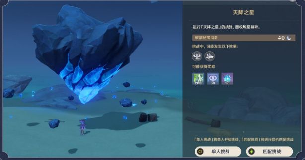 开启第三阶段挑战后,旅行者可以挑战「天降之星」,回收「熄星精粹」。挑战时可以选择单人挑战或者多人联机挑战。