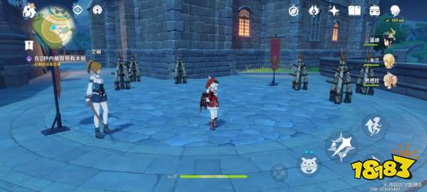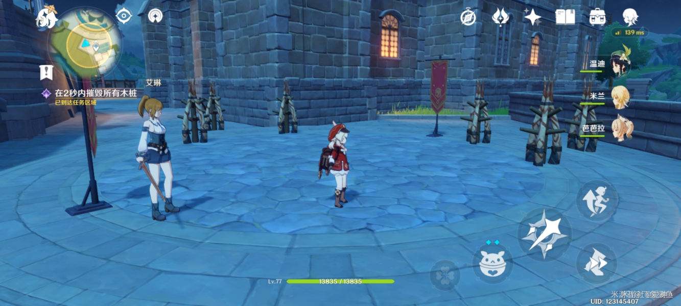 然后站在中心,释放能够覆盖这片范围的群体攻击。比如岩主的元素爆发,风主的E技能,或者爬上墙壁利用高度使用坠击。这些都能够直接将一大片范围内的木桩直接摧毁,完成任务。