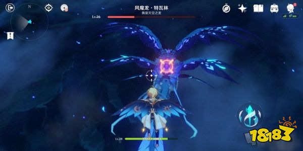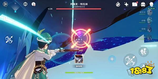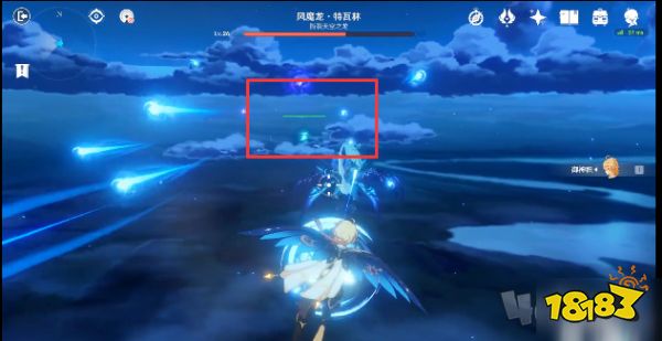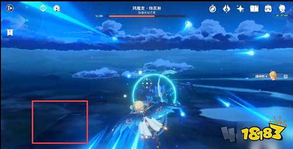 1、首先是刚进入风龙废墟副本,使用温迪,对着这个紫色光圈射击,射到还剩大半血的时候,风魔龙会与你拉开一段距离。