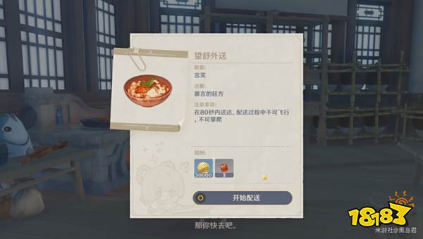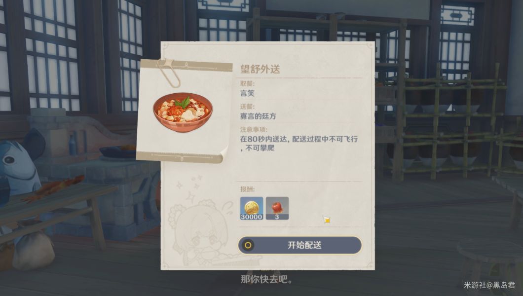 原神望舒外送第五天任务要求:在80秒内送达,配送过程中不可飞行,不可攀爬。