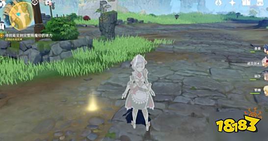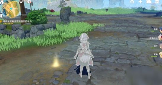 1、这个任务的目的是让我们看到完整的降魔印,望舒客栈门口前面的两块巨石上,就铭刻着部分降魔印,开启【元素视野】往回看,会发现一个发着【黄色光芒】的点位。