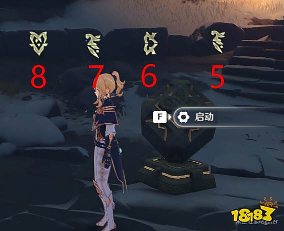 1、首先,这个洞窟的位置位于龙脊雪山这唯一一个七天神像的后左斜下方。其中,映入眼帘的便是一排符号,自右向左依次标记为1-8号。