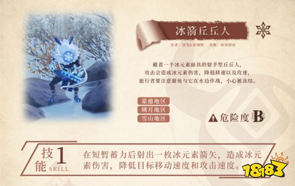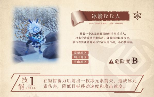 戴着一个冰元素面具的射手型丘丘人,攻击会造成冰元素伤害,降低移速以及攻速,旅行者要注意避免与它在水边作战,小心被冻结。