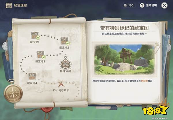 完成指定藏宝地探索后,将解锁带有特别标记的藏宝图,前往藏宝图上的地点,完成特殊宝藏探索后可获得原石等奖励!