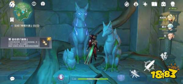 玩家来到这个狐狸雕像前,如下图所示,在树根后面有一个若雷结界,玩家需要对树根进行净化。净化后就会开启了,玩家需要带着雷种子进去,这个时候派蒙会提醒玩家有镇物的存在,玩家不要点的太快,不然容易丢失镇物的线索,玩家跟着任务完成之后需要用雷元素打一下护狸,这样操作之后在它脚下就会出现镇物啦。