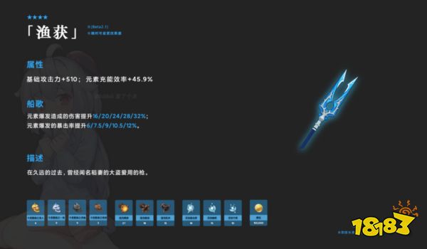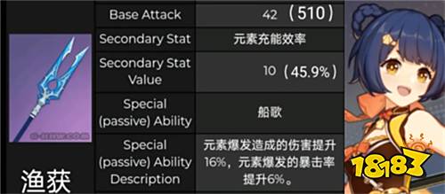 首先渔获的武器特效是加大招的暴击率和伤害,副词条是元素充能,说明非常适合大招脱手的长柄武器副C。目前符合条件的角色有【香菱、雷神、罗莎莉亚、钟离】。