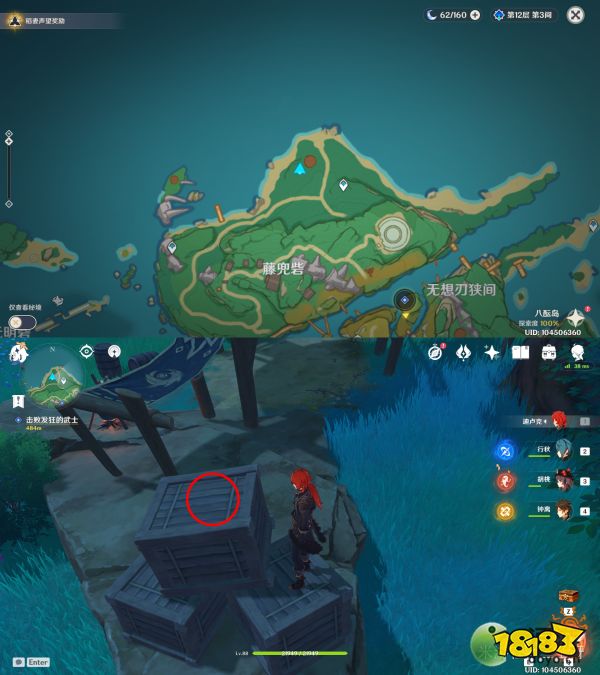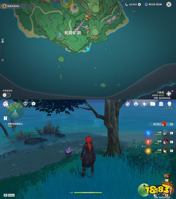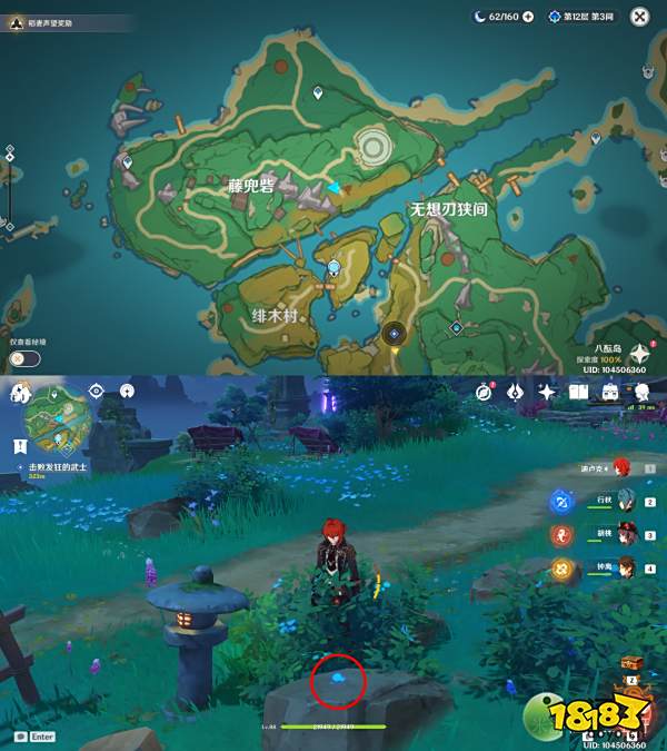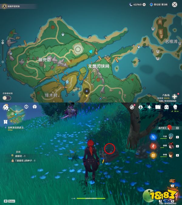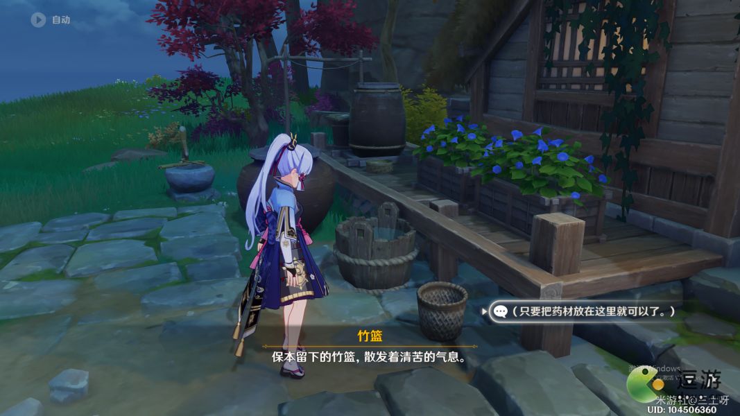 任务结束后,在他家院子的竹篮里放12棵鸣草,次日会出现一个精致宝箱,重复操作直到第三天发现保本并没有回来,宝箱也没有,开启元素视野找到三本「药师的笔记本」(下图红圈),找完之后再去蛇骨矿洞下方锚点获得一个华丽的宝箱。