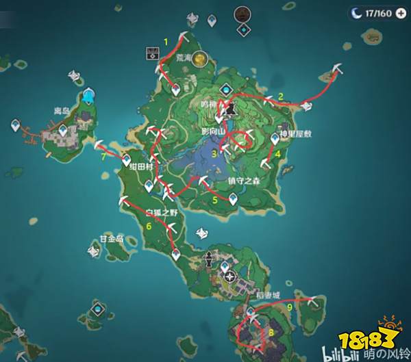 之前我也有提到过璃月的水晶矿最多也差不多在170个左右),因为早柚和稻妻声望的羽扇的实装极大地提高了跑图效率,进一步也提升了挖矿的效率,全图(蒙德璃月稻妻)挖完也仅仅用了不到一个半小时的时间(我自己跑了一遍是80分钟,其实还能压,稻妻路熟了之后可以将总时长控制在75分钟之内),那么下面开始上图讲路线