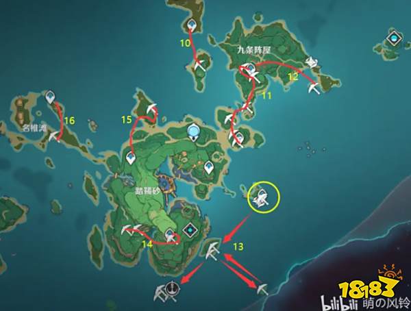 首先是鸣神岛这一块,为了区分我将每天线路用黄色数字做了标注,下面按照编号顺序来逐个细说