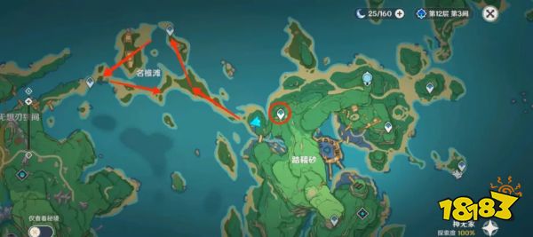 从踏鞴砂的传送锚点下来到这个位置按照上图标记的路线,一圈大概能采二十多朵血斛,如果一个不漏的情况下是29朵血斛。
