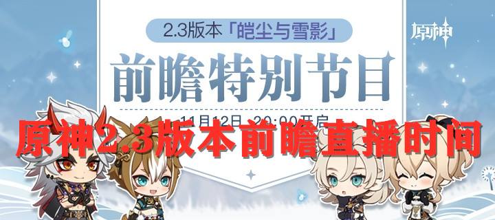 原神2.3版本前瞻直播时间为11月12日(本周五)晚20:00,原神2.3版本皑尘与雪影前瞻特别节目即将开启,将为大家带来2.3版本的更新内容,直播间内还有兑换码等福利掉落。