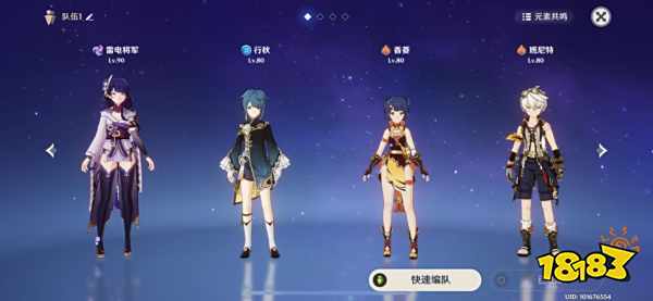 雷电将军E技能起手,切换班尼特QE,切换香菱EQ,切换行秋QE,最后切回雷电将军Q技能站场输出,技能结束后循环即可。