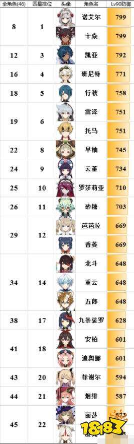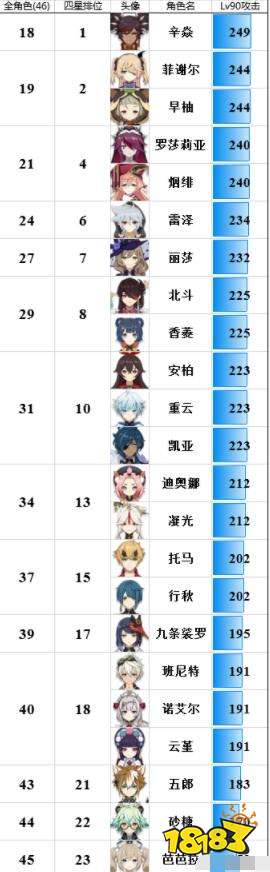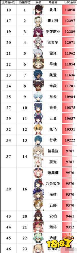 原神2.4版本四星角色基础面板生命值第一位北斗,第二位班尼特,第三位罗莎莉亚,攻击力第一位为辛焱,第二位为谢菲特,第三位为早柚,防御力第一位为艾诺尔,第二位为辛焱,第三位为凯亚。