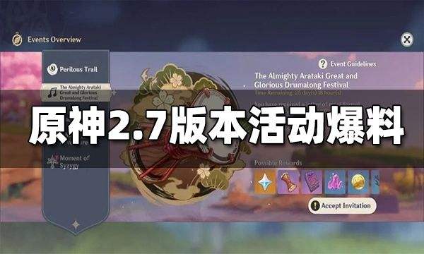 原神2.7版本活动爆料内容是为了庆祝久岐忍璃月留学毕业归来,荒泷一斗准备举办一场名为【荒泷极上盛世豪鼓大祭典】的活动,活动期间,玩家可以演奏七种曲目,完整最低难度可获得60原石,活动共可获得420原石、荒泷【盛世豪鼓】和其他若干奖励。