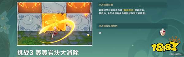 挑战规则:利用诺艾尔攻击岩块获得积分,普通岩块1分,特殊岩块3分,且挑战中角色会持续恢复能量