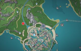 先拾取3个水种子聚集成水之核,找到下图机关,安置水之核,再拾取3个水种子,配合①中的机关,即可同时点亮周围的水元素方碑,完成解谜,之后抬升水元素方碑即可。