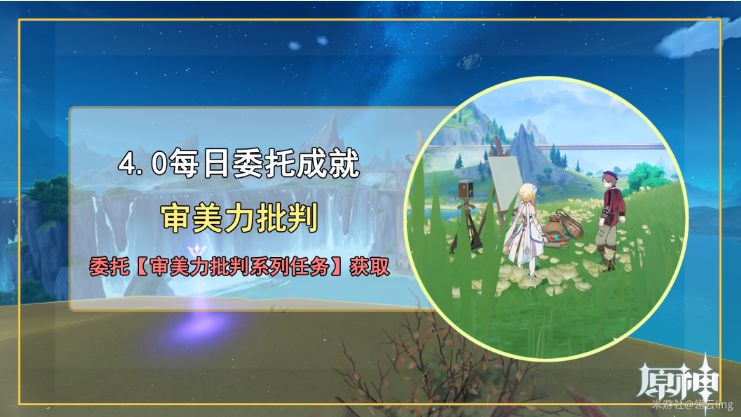 原神审美力批判成就获得方法,只需要按照流程图完成四次任务,完成两次审美力批判美学原理批判]后,第三次刷出审美力批判实践创作批判,最后刷出第四次任务审美力批判自我批判,完成即可获得成就。