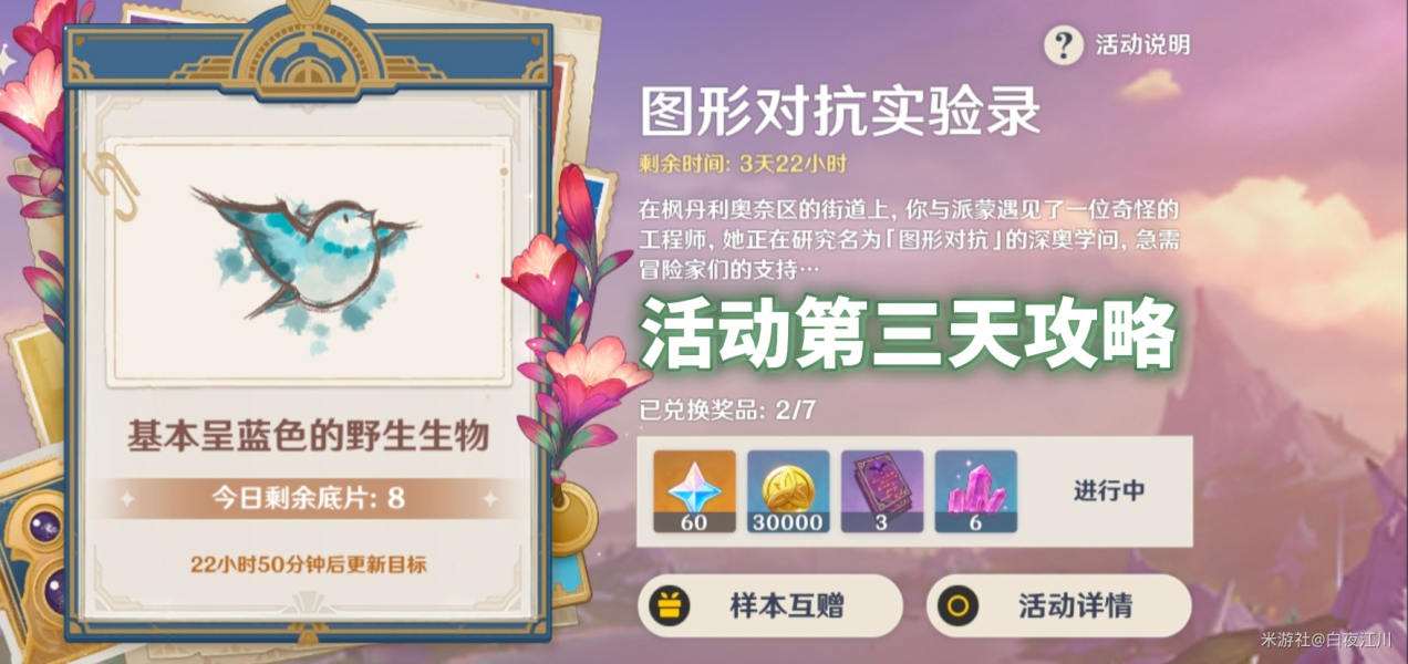 原神图形对抗实验录第三天中,需要拍摄基本呈蓝色的野生生物。推荐拍摄水晶蝶,位置分别在枫丹廷西侧、罪祸的终末秘境山坡处、黎翡区七天神像、塔拉塔海谷、幽林雾道、莫尔泰区七天神像、卡布狄斯堡遗迹南侧。