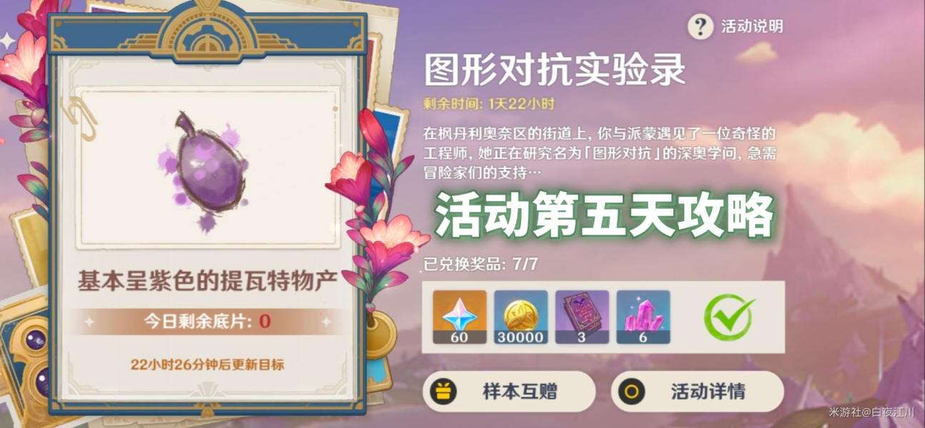原神图形对抗实验录第五天中,需要拍摄基本呈紫色的提瓦特物产。推荐拍摄久雨莲、柔灯铃和电气水晶。分别分布在至苍晶区、苍晶区东北角、枫丹廷北部秘境、boss千年珍珠骏麟的锚点和湖中垂柳锚点。