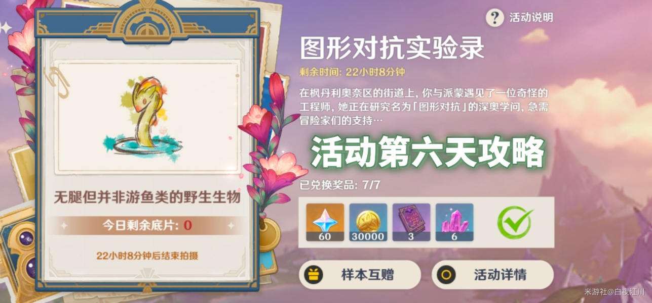 原神图形对抗实验录第六天中,需要拍摄无腿但并非游鱼类的野生生物。推荐拍摄各类晶蝶以及各种鳗鱼。分别分布在幽林雾道、莫尔泰区七天神像、镔铁沙丘、须弥活力之家、孤云阁秘境、层岩巨渊和海祇岛。