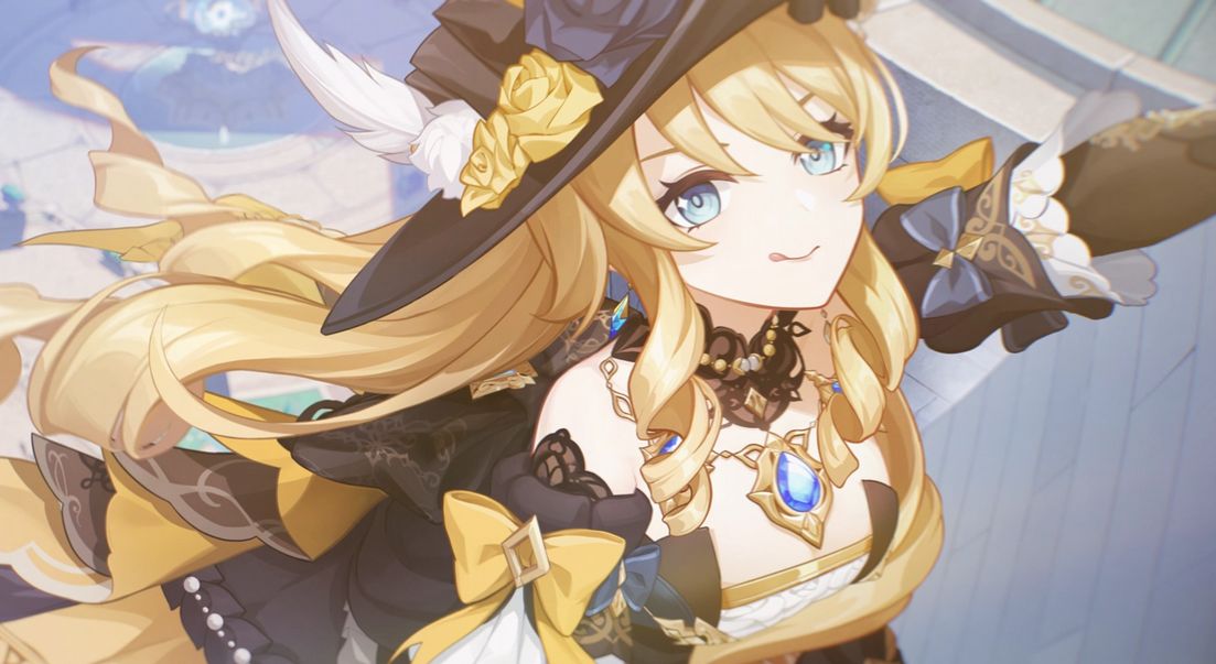 1、娜维娅留着一头金色长卷发,眼睛是湛蓝色,袖子上系有黄色蝴蝶结,岩属性的神之眼挂在左手臂上。