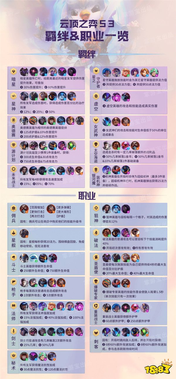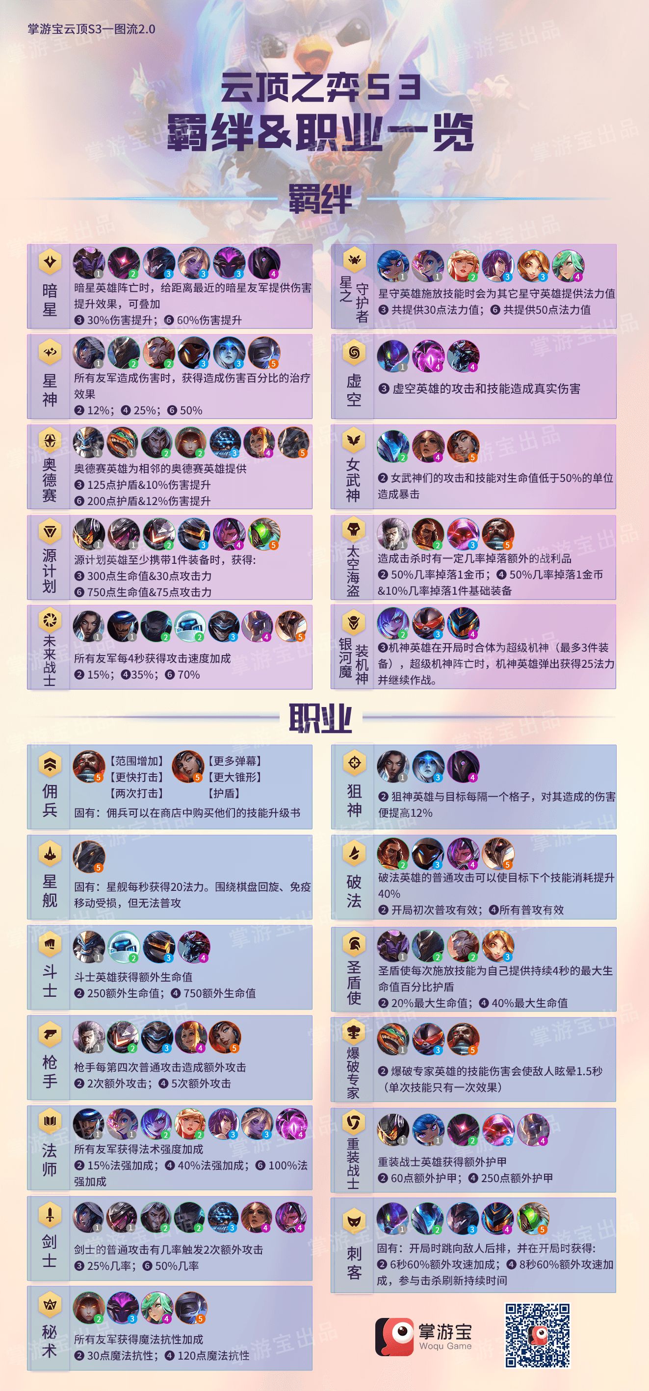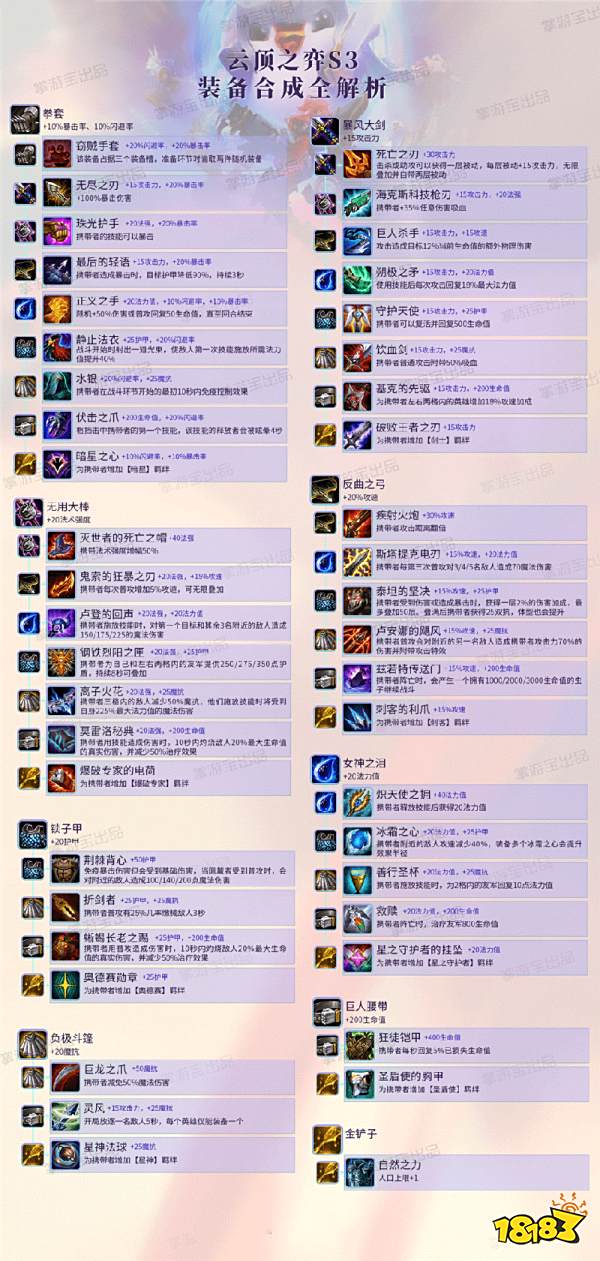 云顶之弈S3赛季正值PBE测试期间,知晓许多小伙伴对新赛季的好奇,而又限于种种因素不能亲自体验。下面小编就为大家带来了云顶S3赛季一图流,职业羁绊装备解析,你想要的这都有。