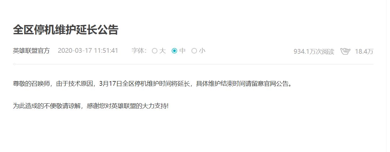 原定3月7日中午12点更新结束的英雄联盟,发布同更新延长通知。英雄联盟客户端-全区停机维护延长公告尊敬的召唤师,由于技术原因,3月17日全区停机维护时间将延长,具体维护结束时间请留意官网公告。为此造成的不便敬请谅解,感谢您对英雄联盟的大力支持!
