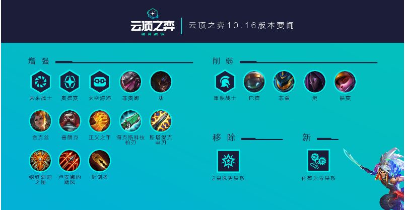 云顶之弈这次没有电影预告导言了,直入正题吧。在前几周的【暗星】称霸之后,《云顶之弈》团队对当前战术生态的状态感到好多了。这周里,《云顶之弈》团队的目标是增强一些表现不佳的英雄和羁绊,同时略微削弱一下宇航狙,来让战术生态变得更好一点。此外,一些装备也得到了大刀阔斧的调整,因此请前往查看这些装备改动,好尝试一些全新的配装组合。新星系【化整为零星系】会在你出售一个英雄时,将其身上的成装拆为基础装备。最后,《云顶之弈》团队还增强了一些追梦羁绊和3星英雄,毕竟梦有多大,舞台就有多大。