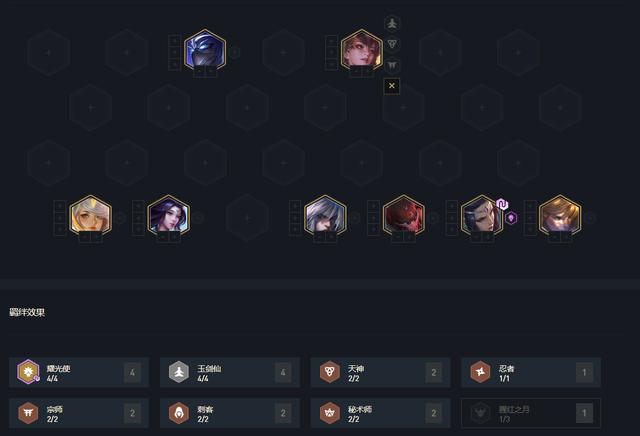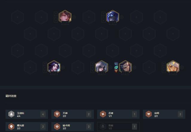 六人口时凑够场上的4玉剑,然后在加上慎组成双秘术双宗师,再带一个拉克丝总成双天神双耀光。至于天选的选择玉剑 宗师 耀光都可以,当然根据不同的天选后期阵容也大不相同,但这个阵容在6级或者7级成型,只要有2星的莫甘娜,基本就能保证你连胜一直进入到8级。到了7级之后可以选择上一个刺客,来增加一下男刀的输出,在这个阵容里面男刀并非主C,但有什么攻击装还是要给男刀的。