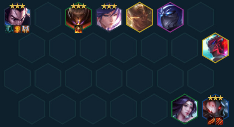 该阵容天克九腥红,配合后期盲僧的踢人,两脚就可以送走至尊加里奥,且该阵容后期也极具Carry能力,阵容成型质量较高就可以恰分吃鸡,但很吃C位的质量以及装备,质量不高装备不好很容易速八出局。