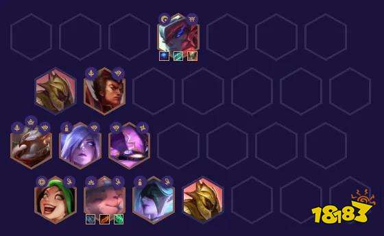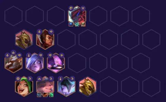 关键有两个点:1、明昼或神射手天选的提莫都可以,当然最好还是神射手天选啦,神射手天选参考上面站位如上图,明昼天选的话要8人口依旧凑4神射手4神盾使。2、神盾天选乖乖玩三国猛将D嘉文四世去啦,这套阵容里面每一个神盾使都是有作用的,所以拿神盾使天选玩神射手确实挺尴尬的。