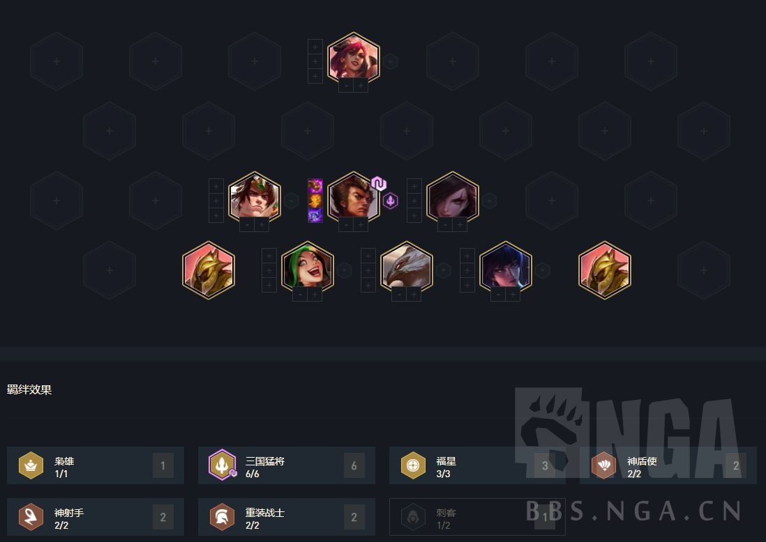 3阶段是阵容的关键点,通常我们在3-2或者3-4上6人口,是否上人口看质量。我们在6级需要卡30-40金币D卡找到三国天选,找到后攒钱上7人口。3阶能有6三国就上6三国强度超高,如果没有也可以三国+其他棋子进行拼多多,如3三国+3福星组合,2射2斗强度还是很高的,胜利能吃到金币,输了等6三国开箱,运气好能掉装备。