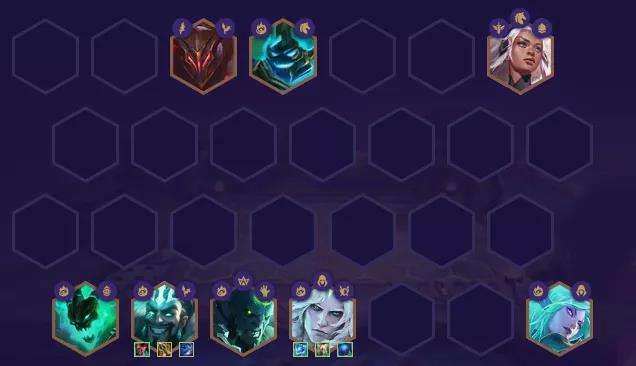 铁铠冥魂—莫德凯撒(4)、战争之影—赫卡里姆(2)、熔铁少女—芮尔(4)、魂锁典狱长—锤石(2)、荣耀行刑官—德莱文(4)、符文法师—瑞兹(4)、破败之王—佛耶戈(5)、不祥之刃—卡特琳娜(3)