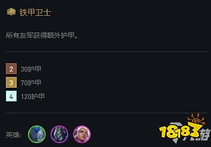 锤石、泰坦、加里奥和盖伦组成了4骑士羁绊,可以让团队获得40点伤害格挡,能够保证阵容的整体坦度,锤石和泰坦有控制,加里奥有嘲讽和免伤,盖伦还有专属的神王·凯旋羁绊。泰坦、贾克斯和芮尔组成了3铁甲卫士羁绊,给团队提升70点护甲属性,可以对抗德莱文、卢锡安、阿克尚和小炮等物理输出阵容,如果天使未能成型的话,贾克斯也可以站出来成为核心输出。