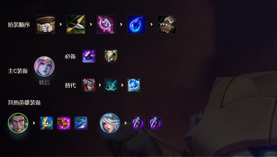 6人口蛛后、西斗之飒、未来守护者、迅箭、天罚神弩(没3换臻冰之箭)、皮城执法官