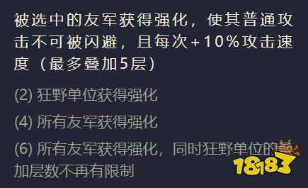 四狂野效果:在战斗开始的时候所以友军强化,被强化过的友军普攻敌人无法闪避并且每次攻击增加10%攻击速度最低5层。(如下图所示)