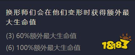 当同时拥有三个换形师、六个换形师的时候羁绊效果分别为:换形师在释放技能变身时额外获取最大生命值60%、100%。(如下图所示)