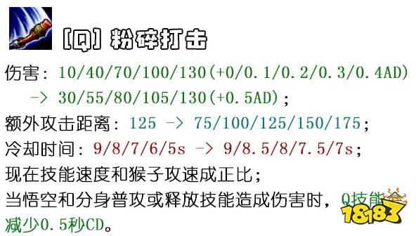 猴子重做的数值改动中包含了热补丁的内容。所以下面的数据其实是10.5版本的老版猴子和10.6国服版本削弱后的猴子。所以有些技能看起来是增强了,其实是已经在上线国服前被热补丁削弱了一轮。