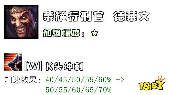 强化了德莱文通过走位找输出空间的能力。不过,如果对面ADC不是卡莎或者轮子妈的话,同等操作下德莱文也不太有大展身手的机会。