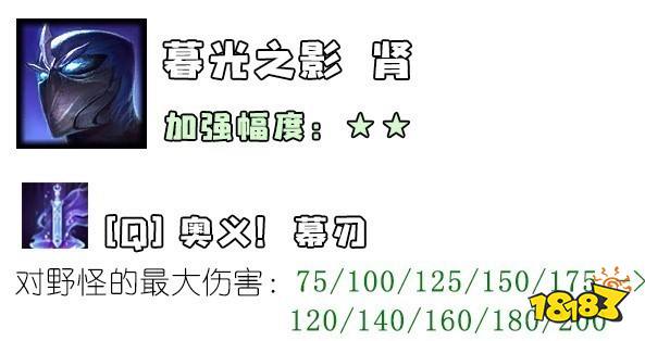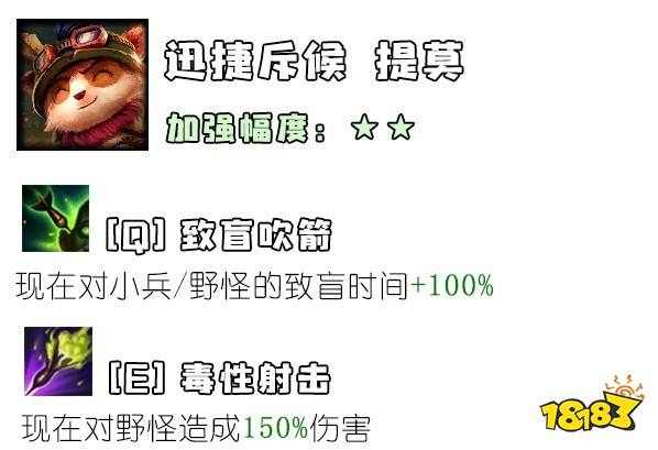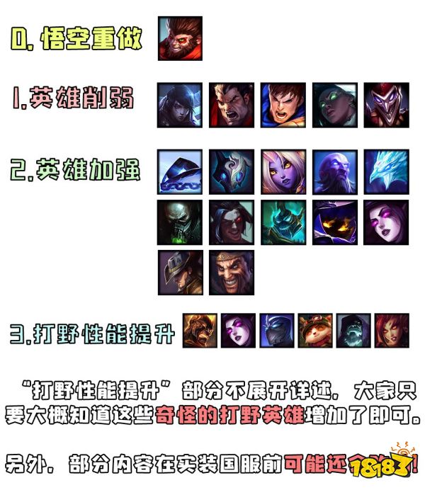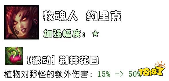 第三栏的“打野性能提升”是怎么回事?几个版本前,nt平衡师就曾发推宣称,“要让更多英雄进入野区”,所以连续几个版本下来,大家都能看到一些奇怪的改动,像什么诺手的出血对野怪伤害增加啦,铁男的被动打野更痛啦,之类的。