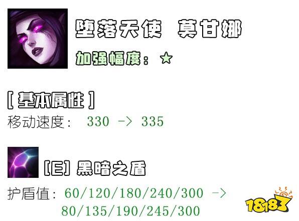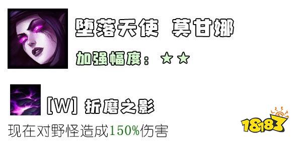 辅助属性上的小加强。在比赛中,莫甘娜逐渐又开始受到了职业选手的欢迎,但是在路人局中,莫甘娜辅助还是适合拿来作Counter Pick,依然不是版本首选的辅助英雄。