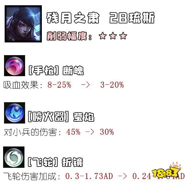 荧焰的改动主要是削弱了2B在对线期利用荧焰推线的能力,在后期影响不大。