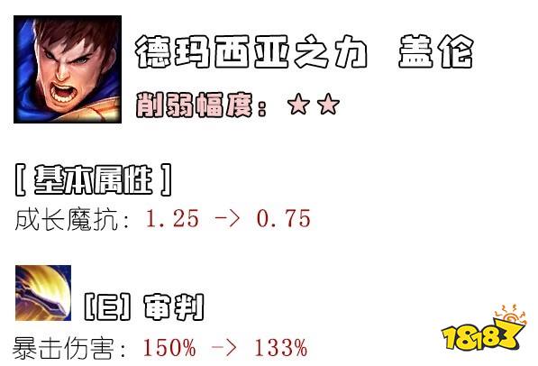 在先前的版本中,装备成型后的盖伦几乎难以限制。这个版本稍微地下调了盖伦的魔抗,并且让E技能从暴击中获得的收益没那么高了。不过,改动之后的盖伦依旧很强势,还是版本T0级别的上单。