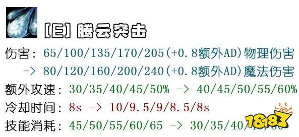 E技能的伤害虽然提升了,但是从物理伤害变为物理加成的魔法伤害,因此不再能从Q技能的破甲中获得伤害收益。