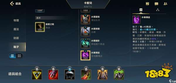 第四件装备我们可以把水银鞋升级成正义荣耀来打团,也可以升级成为传送来打单带牵制敌方,小伙伴们要主要看当前的局势去选择不同的装备,才能帮助到队友。