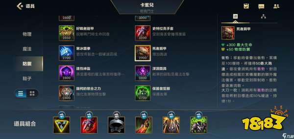 第三件装备我们可以选择复活甲或者死舞,顺风均势局我们就可以出死舞,因为顺风局我们不需要进去卖,我们可以出死舞来打伤害,但是逆风局我们就要进去踢对面C位,开大进去卖为队友创造机会,出复活甲就是最好的选择。