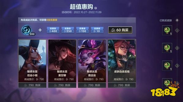4、除了以上奖励之外,还有合作皮肤、图标、头像框奖励。并且10月27日万圣节主题活动也将会开启,主题皮肤上线的同时,游戏内还会开启魅惑女巫系列皮肤的特惠活动,想要购买皮肤的小伙伴千万别错过哦。