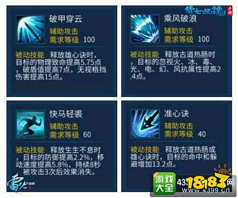 当挑战高难度副本,团队已有主坦克甲士的情况下,侠客可选用破甲穿云、乘风破浪增加团队输出,选择快马轻裘为团队加速和防御,再加准心诀用来提高命中和躲避。