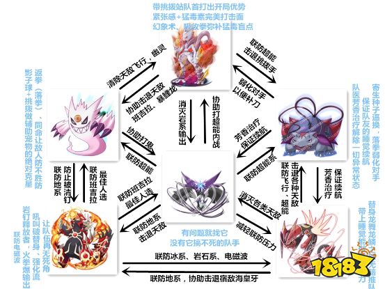5.Mega妙蛙花的毒属性使它免疫猛毒素,同时能联防格斗,草属性免疫寄生种子、同时雷系伤害减半,是联防的一把好手最后就是终极神壕队伍的互助共生图了