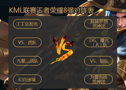 由官方授权18183主办的KML联赛王者荣耀S1资格赛16强赛事已结束全部赛程,经过一番激烈厮杀,八支战队杀出重围晋级8强,他们分别是丁丁会发光、超越梦想男神团、V5虎队、DG曙光A队、九黎灬战队、V5狼队、幻月迷城和为爱而战男神团。8强赛事将于5月13日正式展开,究竟哪支战队可以过关斩将摘得桂冠,让我们拭目以待!